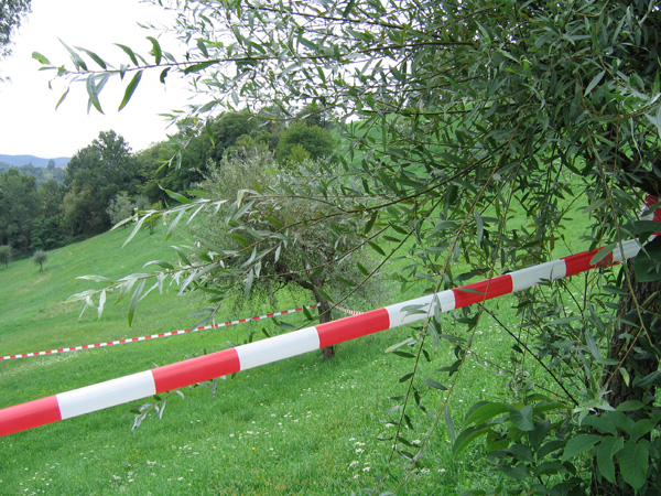 © Renate Egger. Paradies/Paradise, 2006. Installation. Absperrband, Weidenbäume/Barrier tape, willow trees. Sentieri nell`Arte. Baldo Festival. Caprino Veronese, Italy