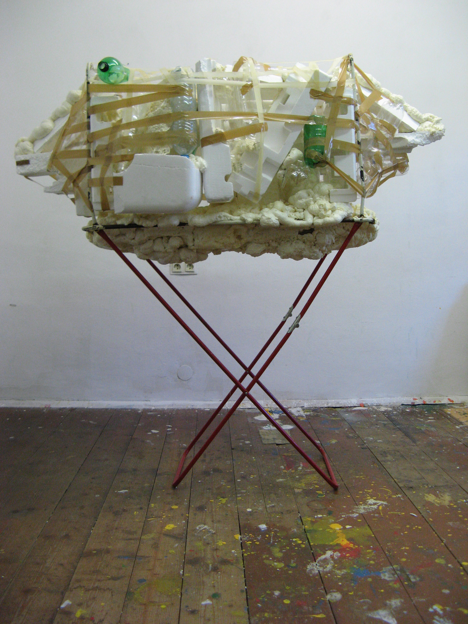 © Wilhelm Roseneder. Offene Erweiterung/Open expansion, 2009. Polyurethan, Klebeband, Styropor, Verpackungsmaterial, Plastikflaschen auf gefundenen Wäschetrockner/Polyurethane, sticky tape, styropor, packing material, plastic bottles on found clothes-dryer.