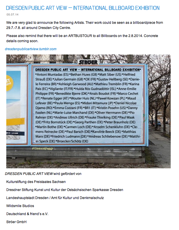 Kunst auf Plakatflächen im öffentlichen Raum der Stadt Dresden/Artworks on Billboards all over Dresden 50 Artworks of international Artists on Billboards in Dresden, Germany Dresden 29. Juli – 8. August 2014