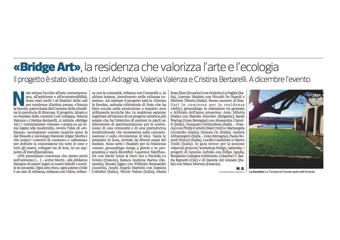 Mercoledì 23 novembre 2016 alle ore 17.00 si svolgerà presso il Macro – Museo d’arte Contemporanea Roma (Sala Cinema) in via Nizza 138, la cerimonia di proclamazione dei vincitori del Bando lanciato da Bridge art//contemporary visions, progetto patrocinato dal Comune di Noto, per l’assegnazione delle prossime residenze d’artista 2016-2017. Le residenze di Bridge Art si svolgeranno a Noto, Patrimonio dell’Unesco, all’interno di Tenuta La Favola, un’azienda vitivinicola a impatto zero da anni all’avanguardia in tecniche di produzione biologica. Esse faranno parte di un più ampio progetto d’arte con l’obiettivo di creare una fucina laboratorio di sperimentazione delle più recenti ricerche del contemporaneo in un sito sensibile ai temi ambientali e legati all’eco-sostenibilità per creare, non solo metaforicamente, una piattaforma multiculturale che sia ponte tra realtà straniere e italiane.