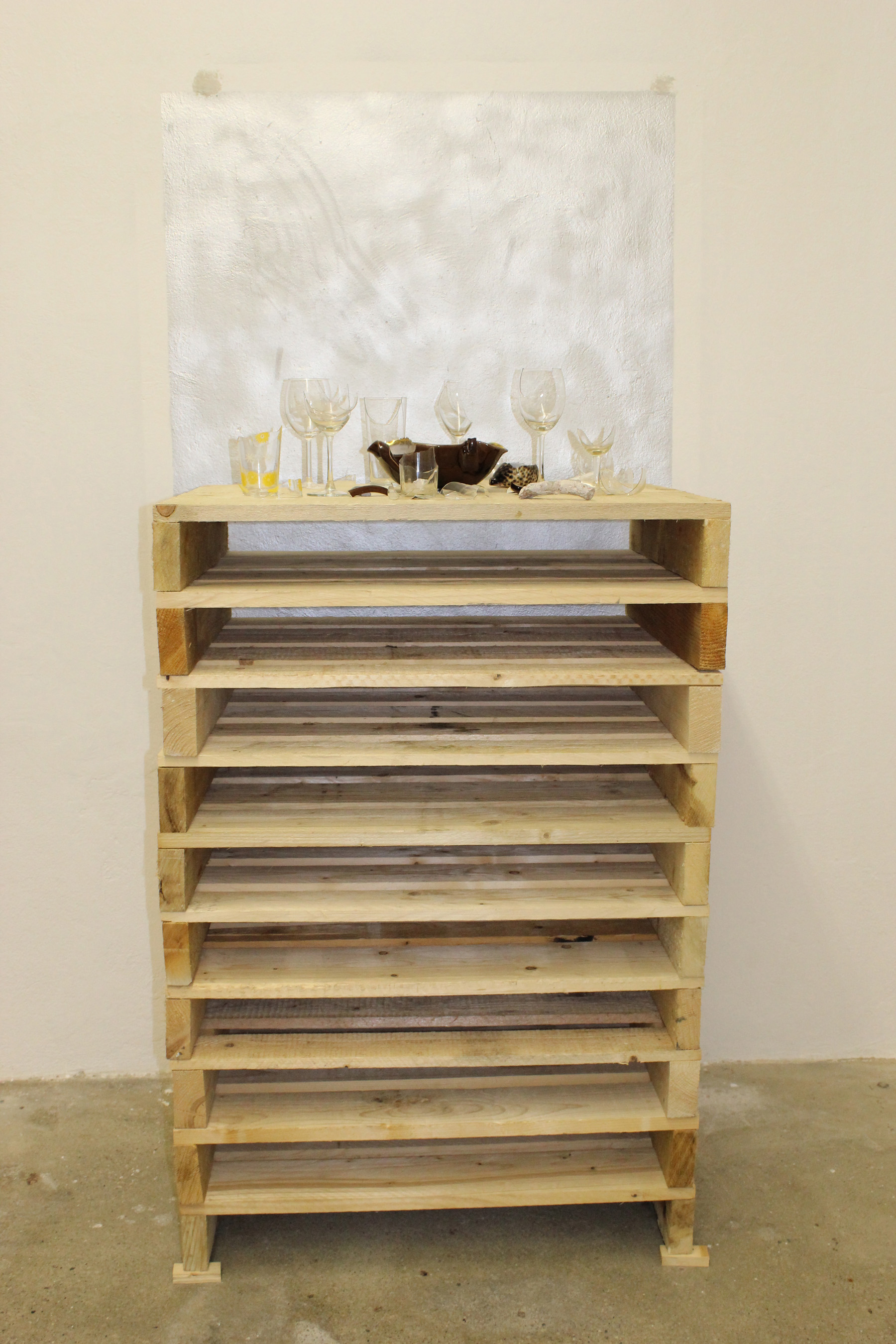 © Renate Egger. Zerbrochene Erinnerungen/Broken memories, 2012. Installation, Fotografie. Gläser, Porzellan, römisches antikes Fragment , Muschel aus Zanzibar auf Holzpaletten/ Installation, photography. Glasses, porcelain, roman antique fragment, shell from Zanzibar on wooden pallets