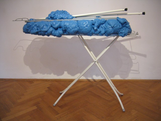 © Wilhelm Roseneder. Hellblaue Erweiterung/Light-blue expansion, 2006. Polyurethan, verschiedene Materialien, Acryllack auf Metall (Bügelbrett)/Polyurethane, various materials, acrylic varnish on metal (ironing board), 1.10×1.50×50 cm