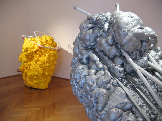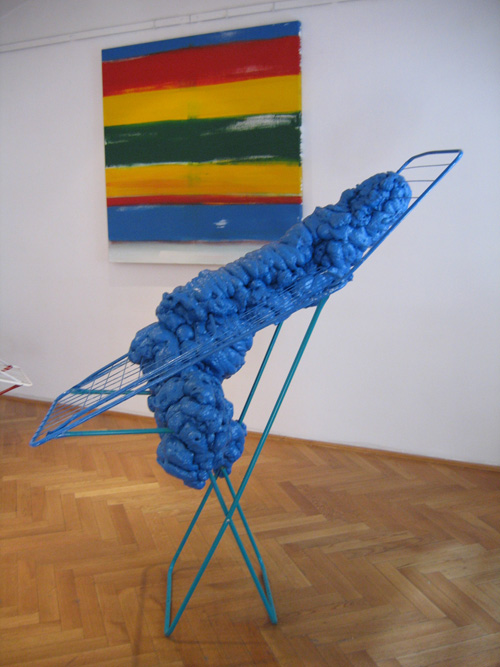 Erweiterungen/Expansions: Polyurethan, Klebestreifen, Styropor, Verpackungsmaterial, Plastikflaschen, Lack auf Metall – Wäschetrockner, Bügelbrett/Polyurethane foam, sticky tape, styropor, packing material, plastic bottles, varnish on metal – airiel drier, ironing-board, 2005-2007.