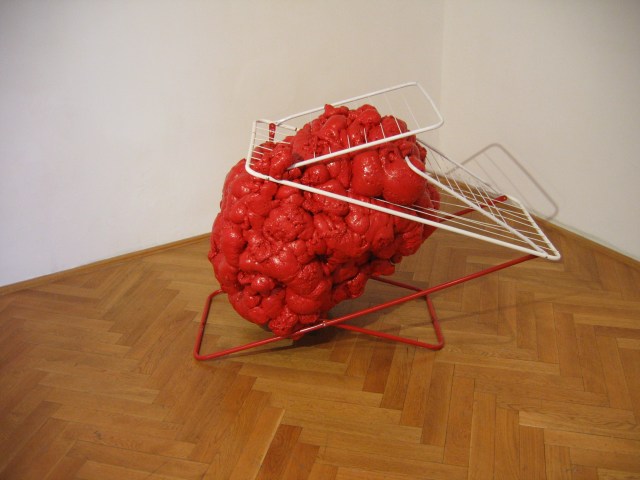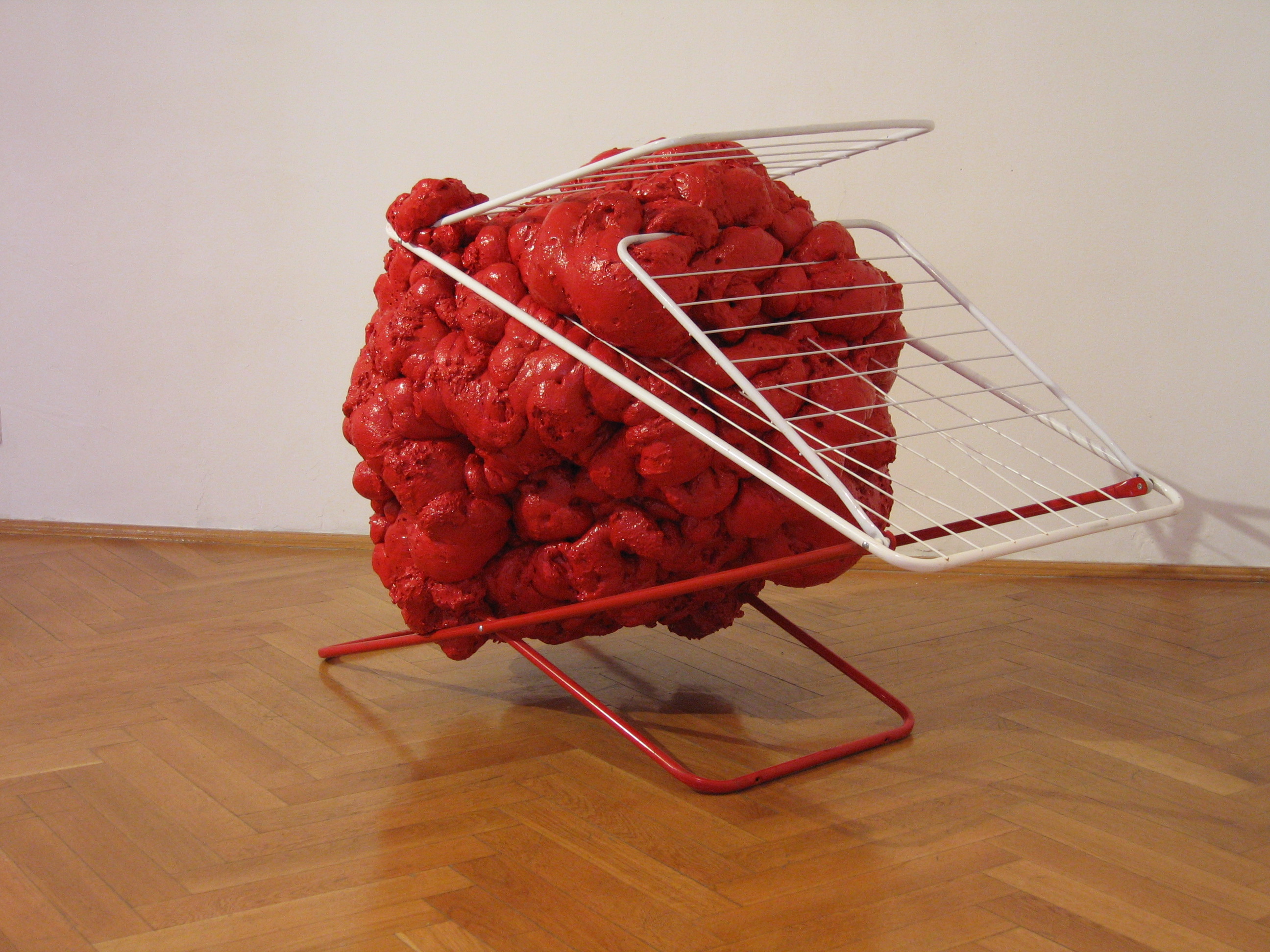 © Wilhelm Roseneder. Rote Erweiterung/Red expansion, 2005. Polyurethan, verschiedene Materialien, Acryllack auf Metall (Wäschetrockner)/Polyurethane, various materials, acrylic varnish on metal (airiel drier), 95×1.10×90 cm