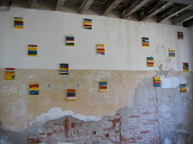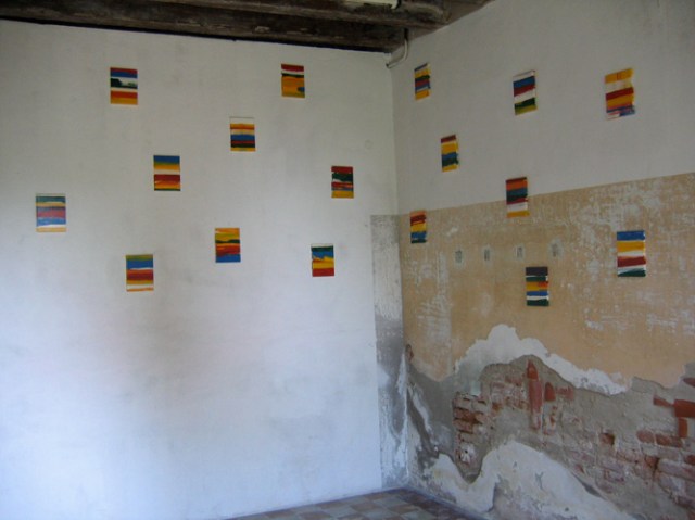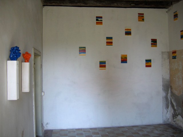 Wilhelm Roseneder. Items 1-17, 2006. Lack auf Leinen/Varnish on canvas, 24×18 cm. Großer blauer Kunstgriff, 2005. Orangener Kunstgriff, 2004. Ungebrannter Ton, Lack/Varnish on non-fired clay, ca. 2o cm high. Pilastro di Bonavigo, Verona, Italy, 2006
