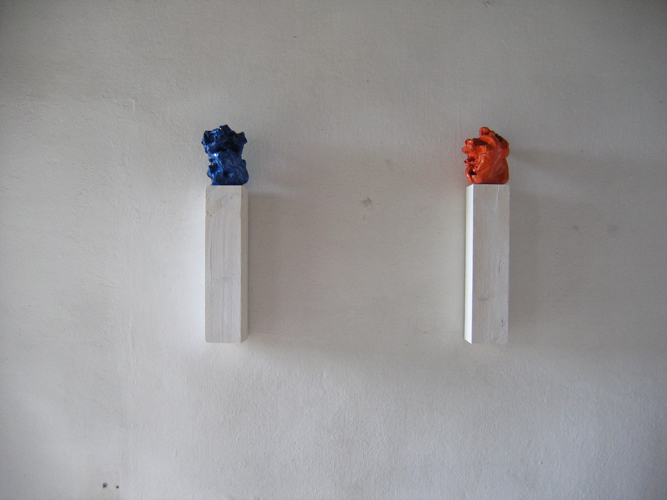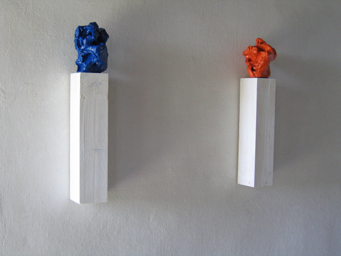 Wilhelm Roseneder. Großer blauer Kunstgriff, 2005. Orangener Kunstgriff, 2004. Ungebrannter Ton, Lack/Varnish on non-fired clay, ca. 2o cm high. Pilastro di Bonavigo, Verona, Italy, 2006